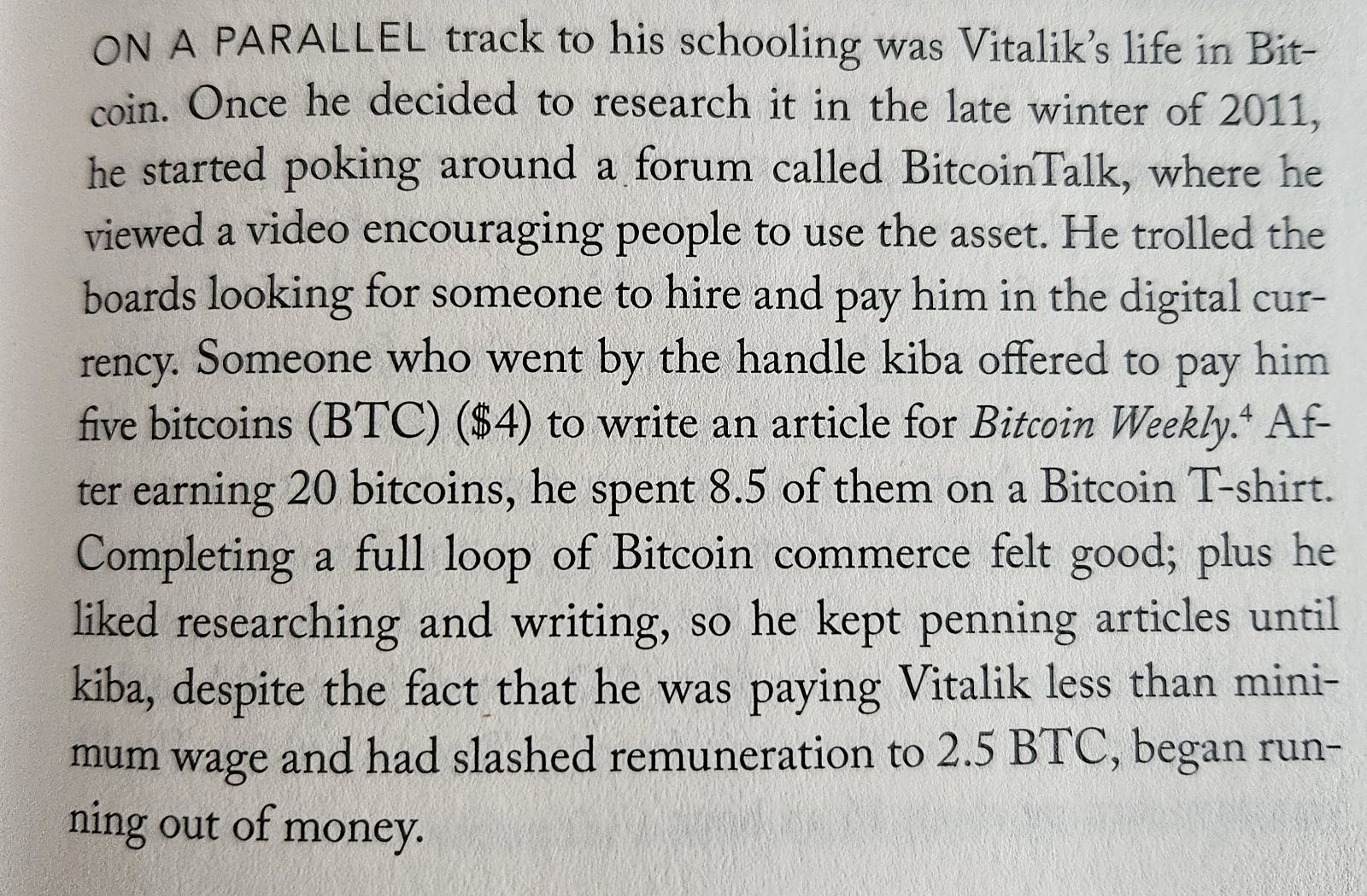 Vitalik Buterin earned his first bitcoins in 2011 by writing articles for *Bitcoin Weekly* (1). Vitalik also offered bounties to Gavin Wood for his Ethereum C++ client on their first communications (2).